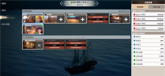 随着你对船只“理解度”的提升,还可以改造船舱,把普通舱升级为高级舱,配置更多航海士。一艘船强不强,外在看吨位,内在就看这艘“移动公寓”里住了多少专业大佬。